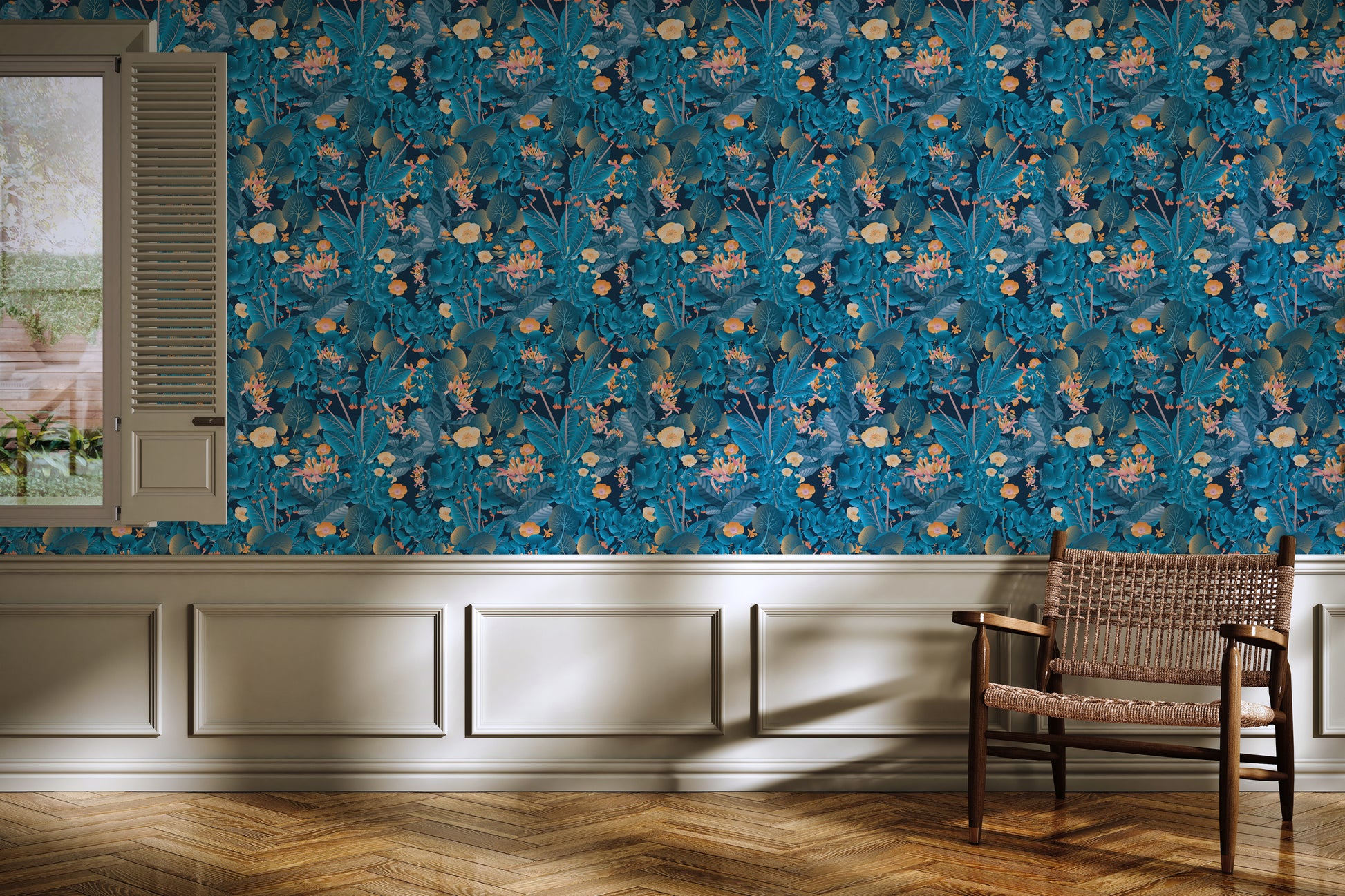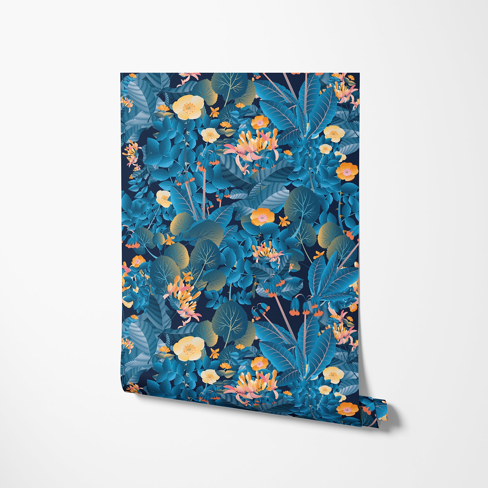 Intense blue floral wallpaper with orange and golden tones for a dramatic nighttime effect. This rich design brings energy and depth to any room.