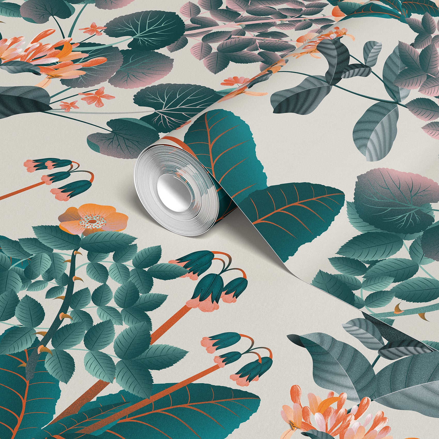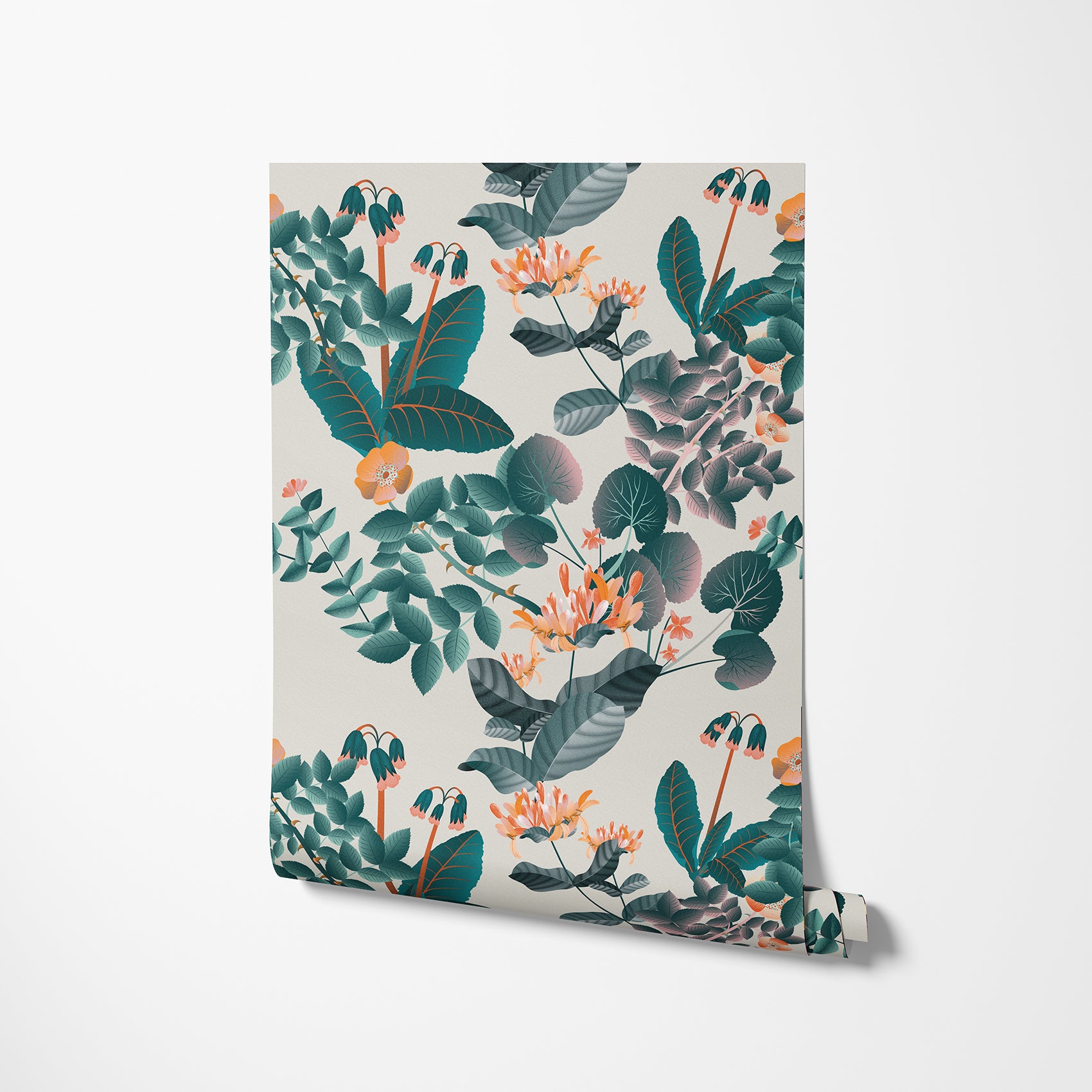 Bright floral wallpaper with rich teal, mandarin, and orange hues. Elegant and refreshing, it brings Shakespearean fantasy to life.